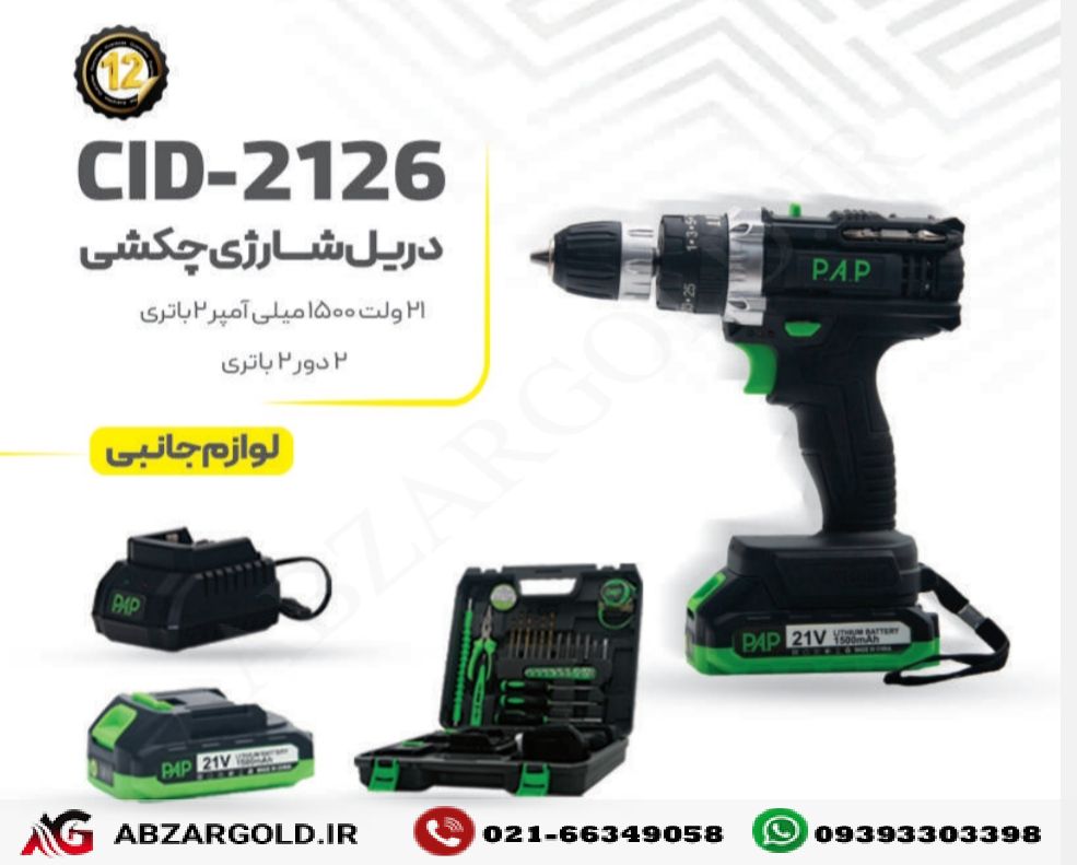 دریل شارژی 21 ولت لیتیوم چکش دار 2 دور 2 باتری مدل CID-2126 برند پی ای پی PAP